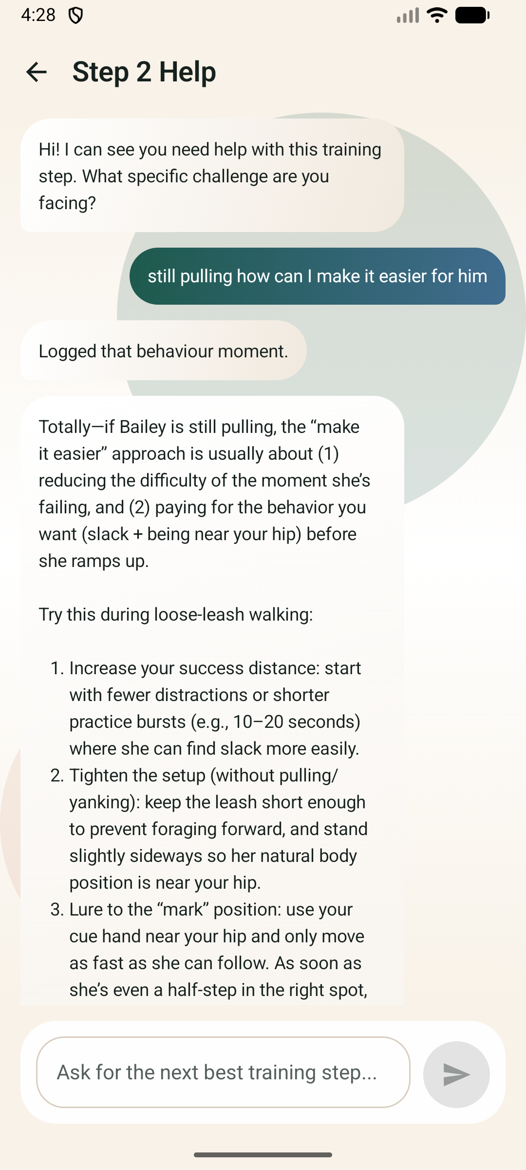 Bailey can use the current goal, step, dog profile, and logged outcomes before suggesting what to try next.